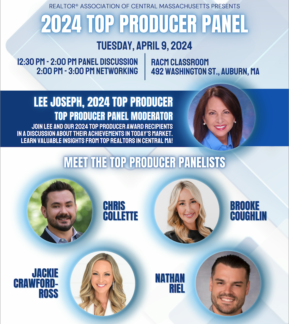 RACM is hosting the 2024 Top Producer Panel on Tuesday, April 9, from 12:30 PM to 3:00 PM in the RACM Classroom. Join Lee Joseph, 2024 Top Producer, and the panelists of 2024 Top Producers: Chris Collette, Brooke Coughlin, Jackie Crawford-Ross, and Nathan Riel, as they discuss their achievements in today's market.