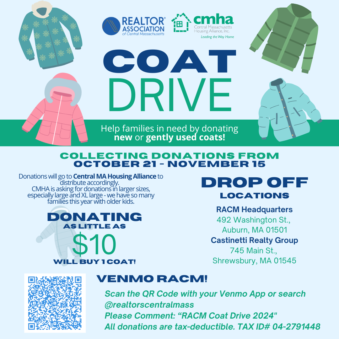 Coats Needed for CMHA! RACM is holding a coat drive until November 15. Donations will go to the Central MA Housing Alliance to distribute accordingly. Please drop off donations at RACM, or donate via Venmo.