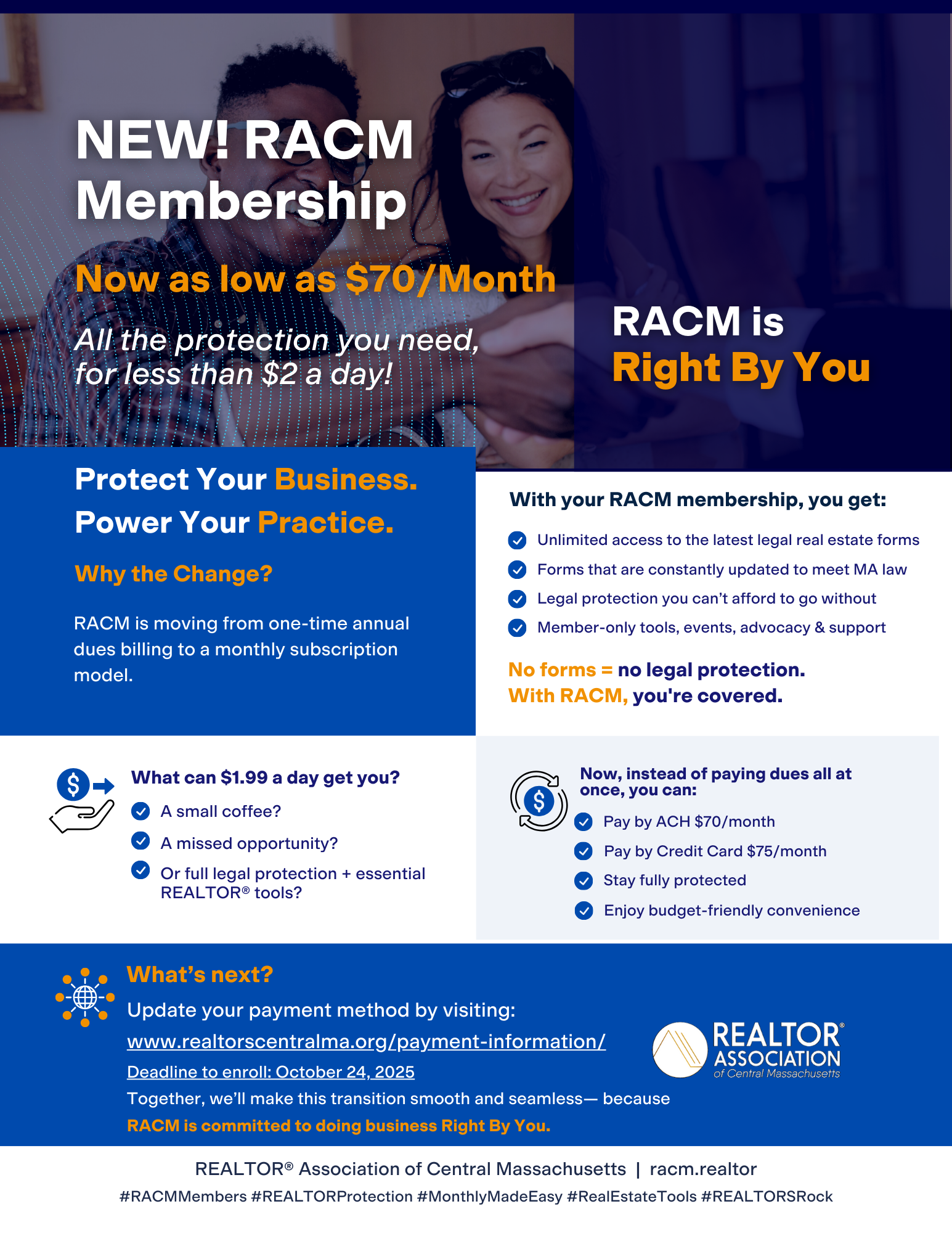 What can RACM do to support you and your business? Please email us at membership@realtorscentralma.org with your feedback, and be sure to include your name and contact information. We look forward to hearing from you!