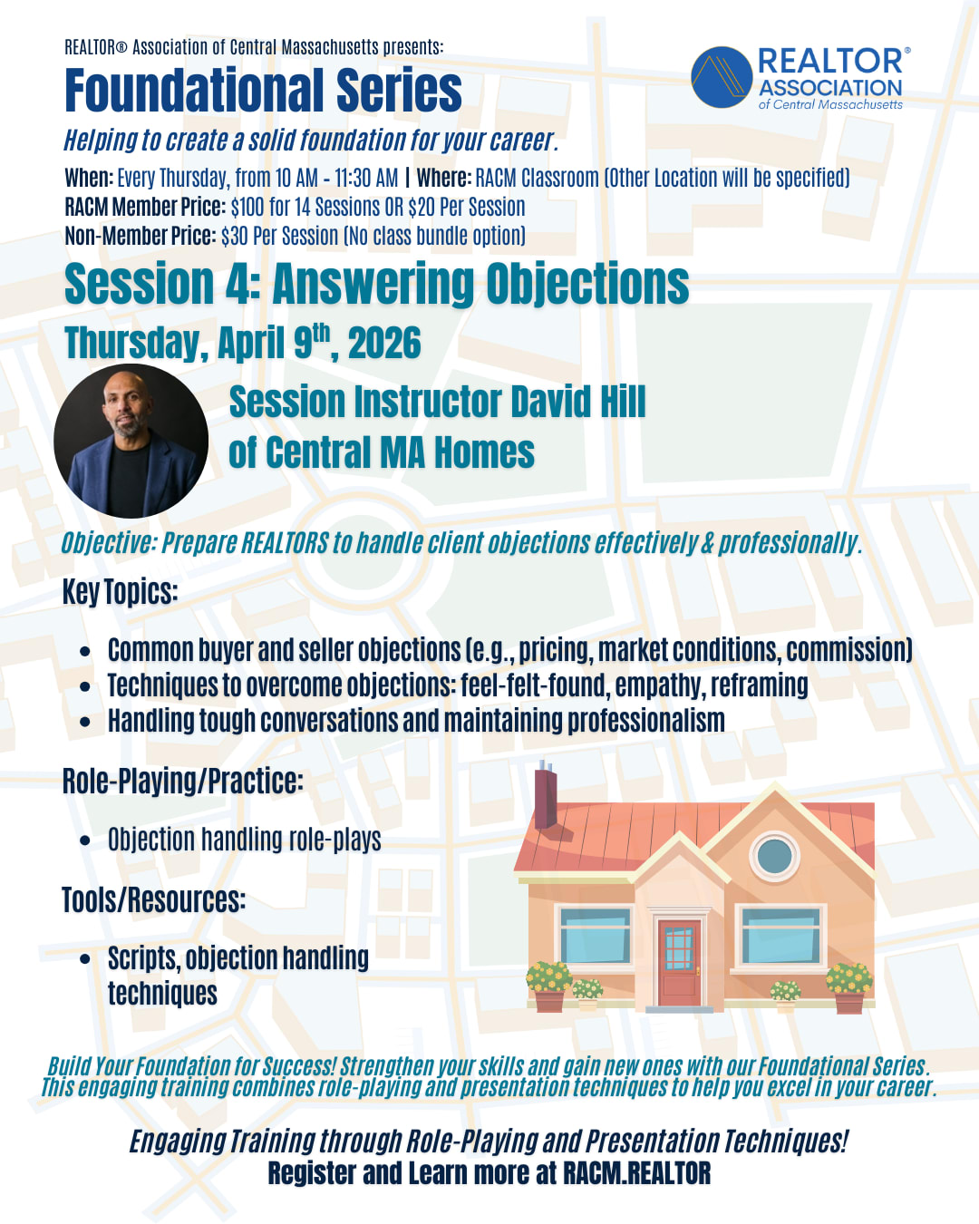 Weekly Series Foundational Series – Helping to create a solid foundation for your career. Thursday of each week from 10 am – 11:30 am Hands-on Training with Role Playing and Presentation techniques Topics