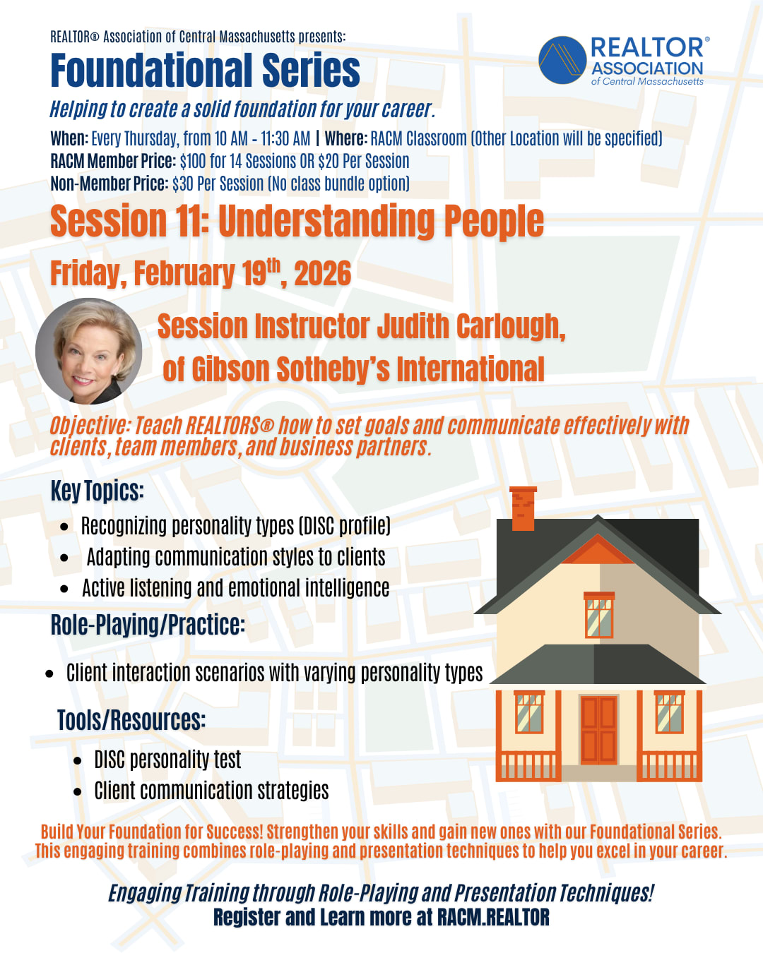 Weekly Series Foundational Series – Helping to create a solid foundation for your career. Thursday of each week from 10 am – 11:30 am Hands-on Training with Role Playing and Presentation techniques Topics