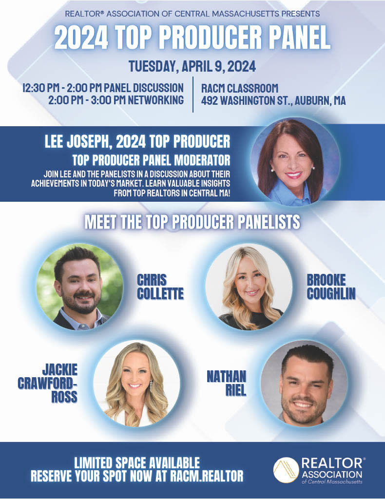 RACM along with our Professional Development Committee will be hosting a Top Producer Panel event on Tuesday April 9, 2024 at 12:30 pm in our classroom located in Auburn MA.