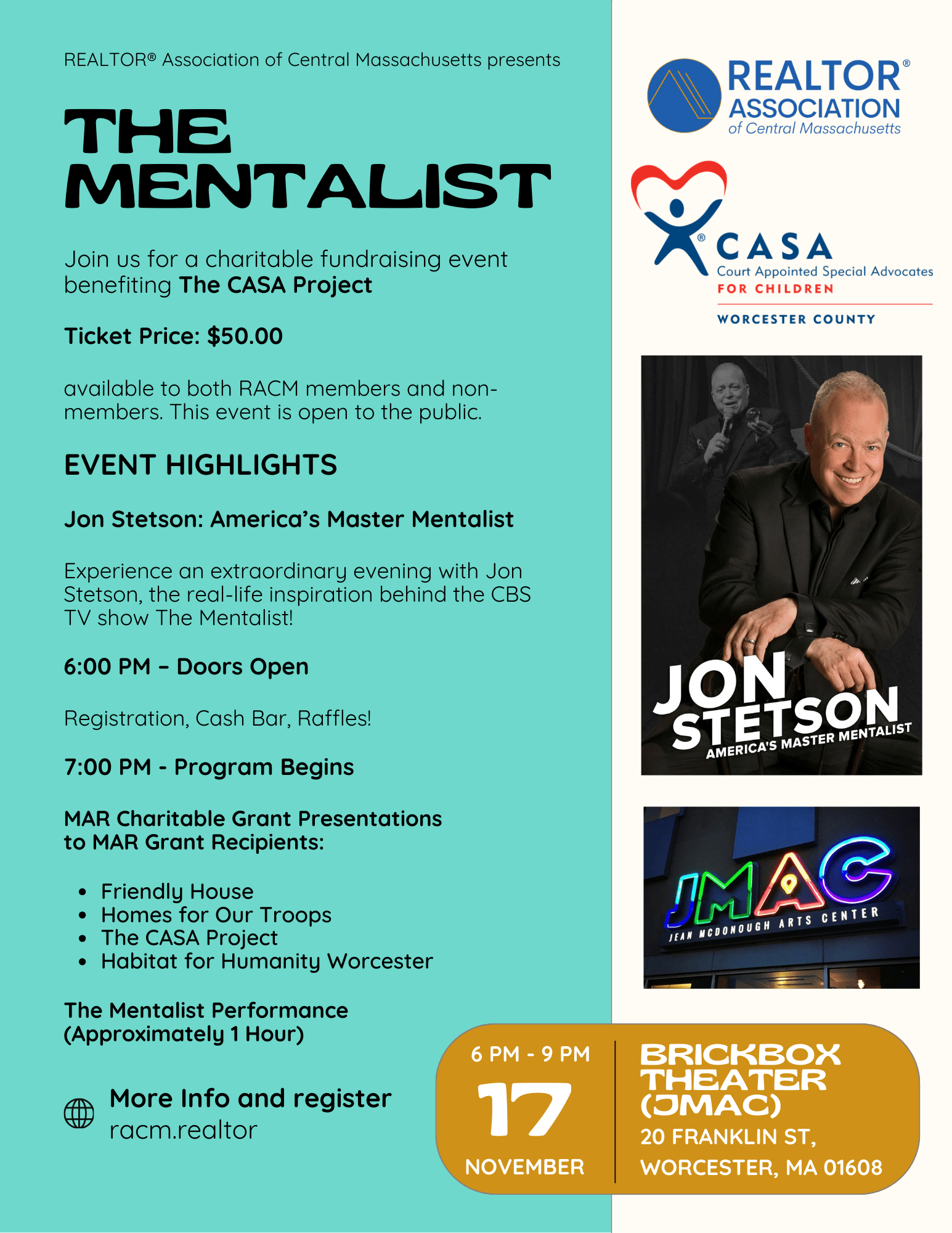 On Monday, November 17th, RACM is hosting a charitable fundraising event at the BrickBox Theater (JMAC) in Worcester to benefit The CASA Project 💛