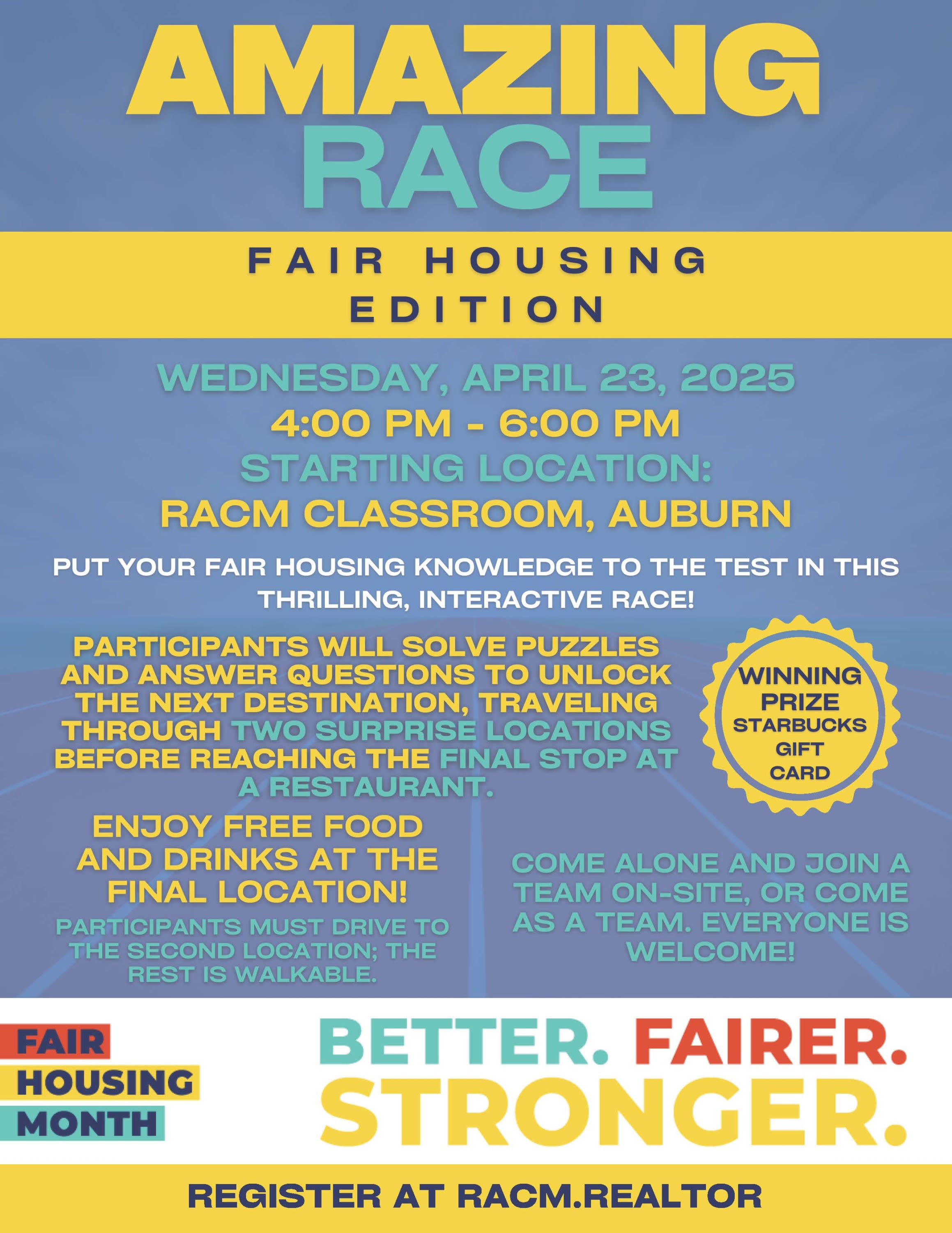 Get ready for a high-energy, interactive challenge that will put your fair housing knowledge to the test! Join us on Wednesday, April 23, 2025, from 4–6 PM, for an exciting race across multiple locations, starting at the RACM Classroom in Auburn.