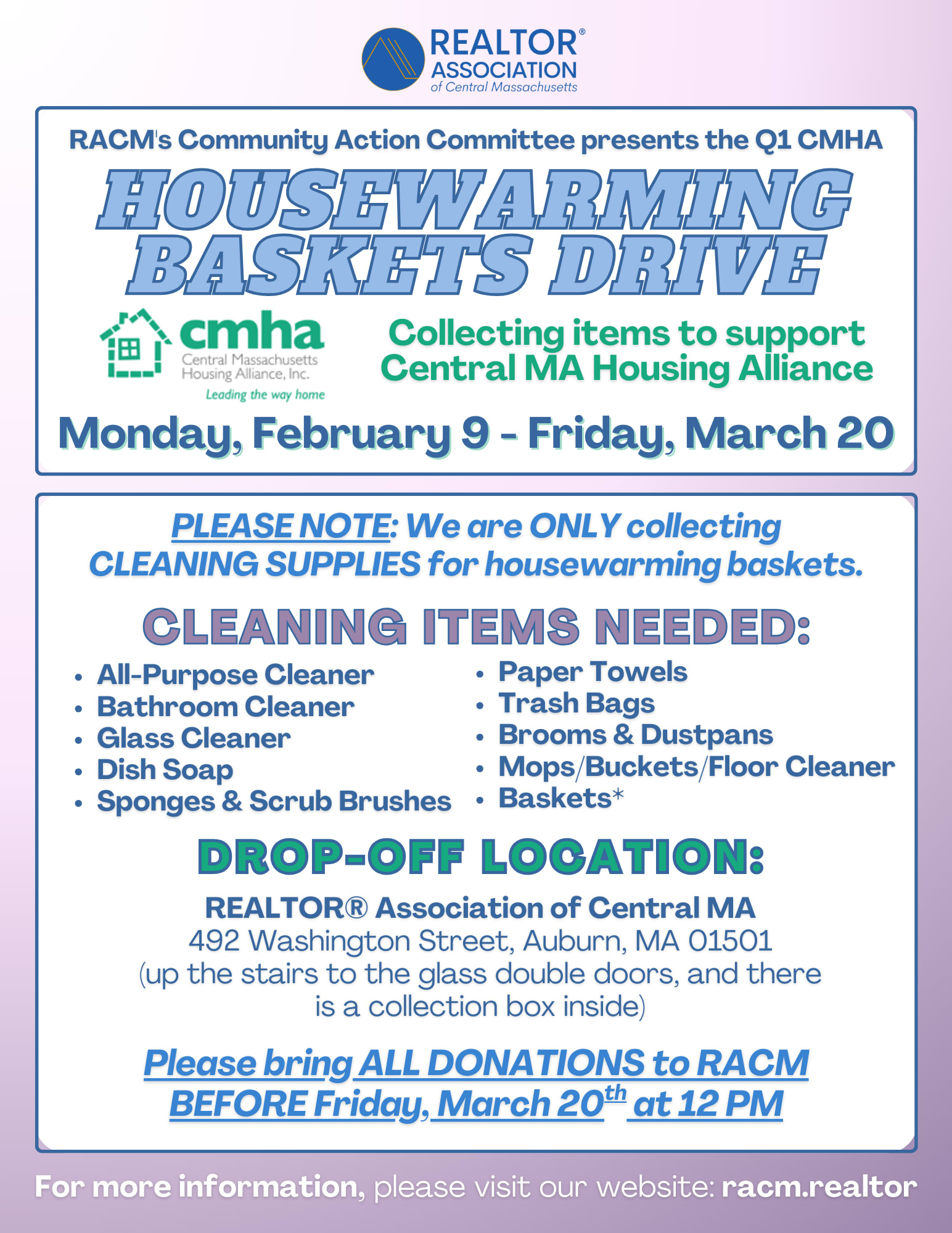 RACM's Community Action Committee presents the Q1 CMHA Housewarming Baskets Drive Collecting items to support Central MA Housing Alliance Monday, February 9 - Friday, March 20