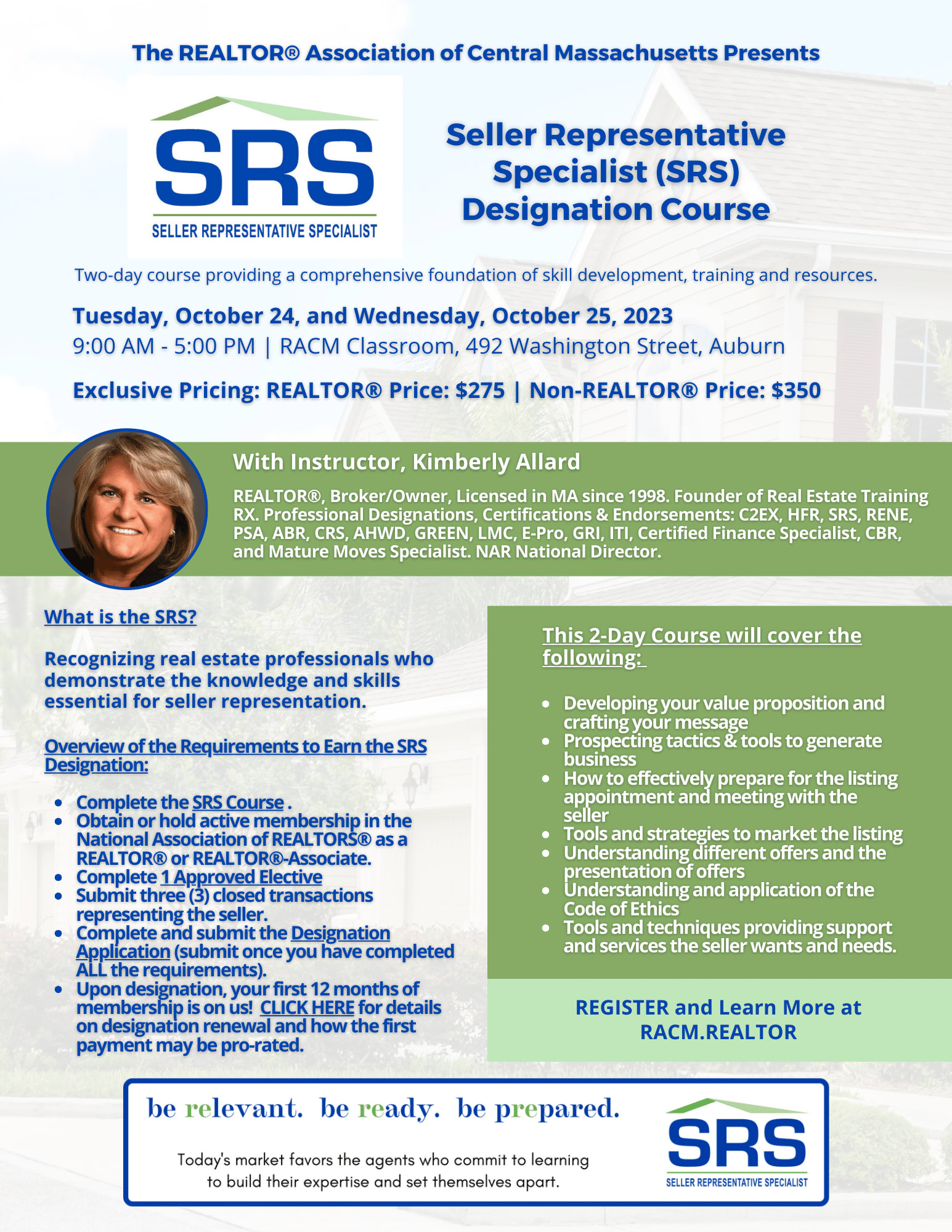 Instructor: Kimberly Allard, REALTOR® Broker/Owner, Licensed in MA since 1998. Founder of Real Estate Training RX. Professional Designations, Certifications & Endorsements: C2EX, HFR, SRS, RENE, PSA, ABR, CRS, AHWD, GREEN, LMC, E-Pro, GRI, ITI, Certified Finance Specialist, CBR, and Mature Moves Specialist. NAR National Director.
